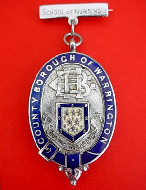 Short Description ...... The County Borough of Warrington School of Nursing Hospital badge was awarded to nurses on completion of training. It is circular in shape and made from (materials), with the hospital name, date of the hospitals construction and motto inscribed in Latin around the circumference. The badge weighs (weight) grams and has a (rear pin/button hole) fixing. Picture: The central design is of (description). Badges (were/were not) named and dated with the name of the recipient on the reverse. ...... |