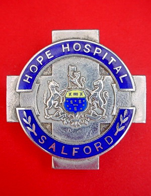 ..... Short Description ...... The Hope Hospital Salford Hospital badge was awarded to nurses on completion of training. It is circular in shape and made from (materials), with the hospital name around the circumference. The badge weighs (weight) grams and has a (rear pin/button hole) fixing. Picture: The central design is of (description). Badges (were/were not) named and dated with the name of the recipient on the reverse. ...... |