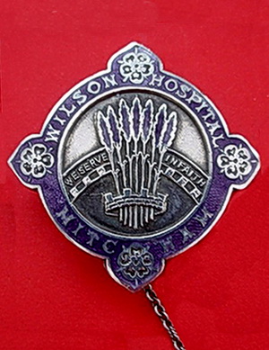 ...... Short Description ...... The Wilson Hospital Mitcham Hospital badge was awarded to nurses on completion of training. It is square in shape with cropped corners and is made from (materials). The badge weighs (weight) grams and has a (rear pin/button hole) fixing. Picture: The central design is of the college logo and inscription against a blue enamel background. Badges (were/were not) named and dated with the name of the recipient on the reverse. ...... |
