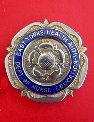 ..... Short Description ...... The East Yorks Health Authority Department of Nurse Education Hospital badge was awarded to nurses on completion of training. It is circular in shape and made from (materials), with the school nam around the circumference. The badge weighs (weight) grams and has a (rear pin/button hole) fixing. Picture: The central design is of (description). Badges (were/were not) named and dated with the name of the recipient on theon the reverse. ...... |