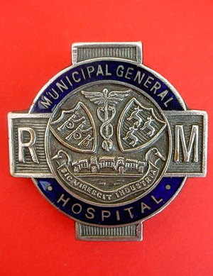 Short Description ...... The Rotherham Municipal General Hospital Hospital badge was awarded to nurses on completion of training. It is circular in shape and made from (materials), with the hospital name, date of the hospitals construction and motto inscribed in Latin around the circumference. The badge weighs (weight) grams and has a (rear pin/button hole) fixing. Picture: The central design is of (description). Badges (were/were not) named and dated with the name of the recipient on the reverse. ...... |
