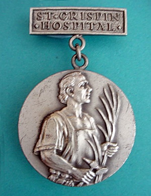 ...... Short Description ...... The St Crispin Hospital Hospital badge was awarded to nurses on completion of training. It is square in shape with cropped corners and is made from (materials). The badge weighs (weight) grams and has a (rear pin/button hole) fixing. Picture: The central design is of the college logo and inscription against a blue enamel background. Badges (were/were not) named and dated with the name of the recipient on the reverse. ...... |