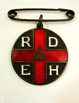 ...... Short Description ...... The Royal Devon & Exeter Hospital Hospital badge was awarded to nurses on completion of training. It is circular in shape and made from (materials), with the hospital name, date of the hospitals construction and motto inscribed in Latin around the circumference. The badge weighs (weight) grams and has a (rear pin/button hole) fixing. Picture: The central design is of (description). Badges (were/were not) named and dated with the name of the recipient on the reverse. ...... |