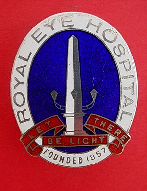 ...... Short Description ...... The Royal Eye Hospital badge was awarded to nurses on completion of training. It is circular in shape and made from (silver), with the service name around the circumference. The badge weighs (weight) grams and has a (rear pin/button hole) fixing. Picture: The central design is of (description). Badges (were/were not) named and dated with the name of the recipient on the reverse. ...... |
