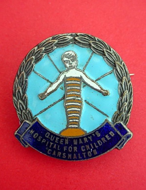 Short Description ...... The Queen Mary's Hospital for Children Carshalton Hospital badge was awarded to nurses on completion of training. It is made from (materials). The badge weighs (weight) grams and has a (rear pin/button hole) fixing. Picture: The central design is of is basically a square red cross supporting and two circles with the hospital and school name around the circumferences with the central circle containing the hospital crest. The badges (were/were not) named and dated with the name of the recipient on the reverse ....... |