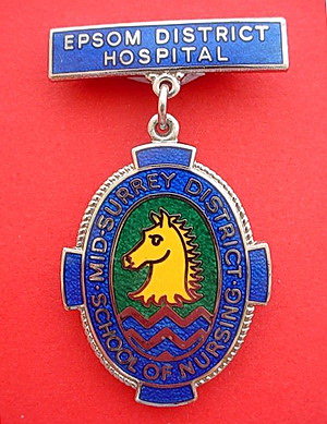 Short Description ...... The Epsom Mid-Surrey District School of Nursing Hospital badge was awarded to nurses on completion of training. It is a square cruciform shape with a central circular area with a looped suspension bar above. It is made from (Metal) metal. The badge weighs (weight) grams and has the top looped suspension bar fixing. Picture: The central oval design contains the name of the hospital around the circumference with the central coat of arms coloured enamel. Badges (were/were not) named and dated with the name of the recipient on the reverse. |
