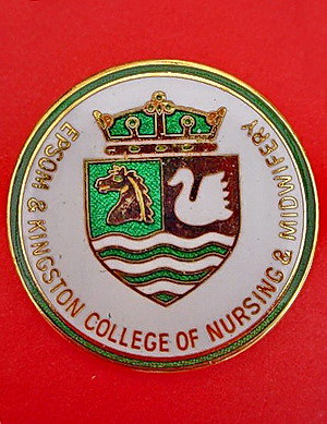 ..... Short Description ...... The Epsom & Kingston College of Nursing & Midwifery Hospital badge was awarded to nurses on completion of training. It is circular in shape and made from (materials), with the hospital name around the circumference. The badge weighs (weight) grams and has a (rear pin/button hole) fixing. Picture: The central design is of (description). Badges (were/were not) named and dated with the name of the recipient on the reverse. ...... |