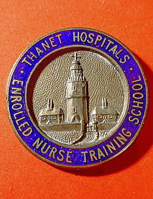 ..... Short Description ...... The Thanet Hospitals Enrolled Nurse Training Hospital badge was awarded to nurses on completion of training. It is circular in shape and made from (materials), with the hospital name around the circumference. The badge weighs (weight) grams and has a (rear pin/button hole) fixing. Picture: The central design is of (description). Badges (were/were not) named and dated with the name of the recipient on the reverse. ..... |