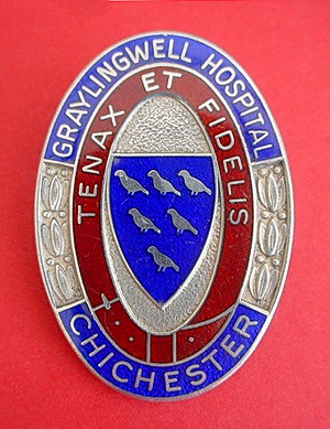 Short Description ...... The Graylingwell Hospital Hospital badge was awarded to nurses on completion of training. It is circular in shape and made from (materials), with the hospital name, date of the hospitals construction and motto inscribed in Latin around the circumference. The badge weighs (weight) grams and has a (rear pin/button hole) fixing. Picture: The central design is of (description). Badges (were/were not) named and dated with the name of the recipient on the reverse. |