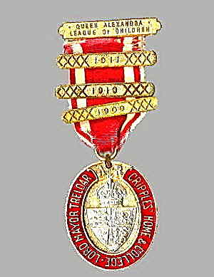 Short Description ...... The Queen Alexandra League of Children Lord Mayor Treloar Cripples Home badge was awarded to nurses on completion of training. It is oval in shape and made from (materials), with the hospital name around the circumference. The badge weighs (weight) grams and has a (rear pin/button hole) fixing. Picture: The central design is of (description). Badges (were/were not) named and dated with the name of the recipient on the reverse. |