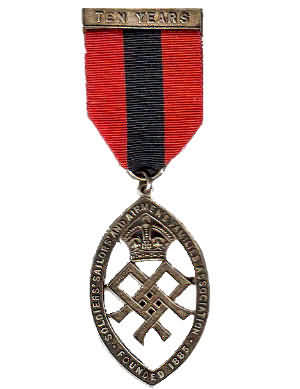 ..... Short Description ...... The Soldiers Sailors and Airmen Families Association charity Ten Years Service medal. It is oval in shape and made from sterling silver,with the SSAFA name around the circumference. The badge weighs (weight) grams and has a (rear pin/button hole) fixing. Picture: The central design is of a kings crown sitting above an armed service emblem.