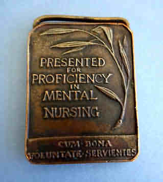 A large and impressive bronze medal for Proficiency in Mental Nursing, from the Retreat Hospital in York. This was founded by William Tuke, in 1796 as a private Asylum for Quakers and went on to pioneer many innovative treatments for mental illness. See; https://www.revolvy.com/page/William-Tuke Measuring 47mm by 33mm,the medal face bears an image of William Duke, Founded the Retreat York 1792.The reverse shows leaves and branches and Presented for Proficiency Mental Nursing. Below this it bears the latin motto Cum Bona Voluntate Servientes which translates as 'With Good Will, Doing Service'. The medal is named around the rim to Emma A Bradley - 22nd July 1922 - The Retreat York. It would originally have been worn mounted on a plain beige silk ribbon but this is now absent. The final picture (curtesy of the Welcome Institute) shows such a medal being worn!